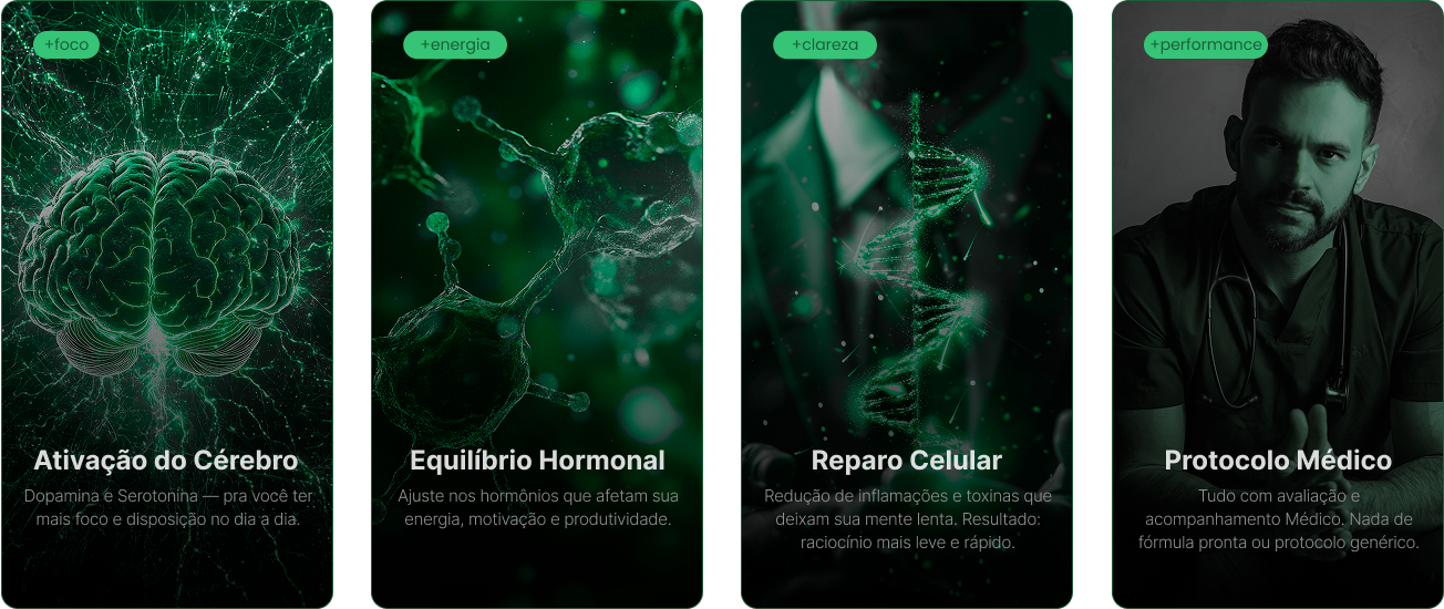 Há mais de 10 anos, ele desenvolve protocolos personalizados que tiram pessoas do cansaço crônico e colocam em estado de alta performance — com ciência, estratégia e acompanhamento de verdade.